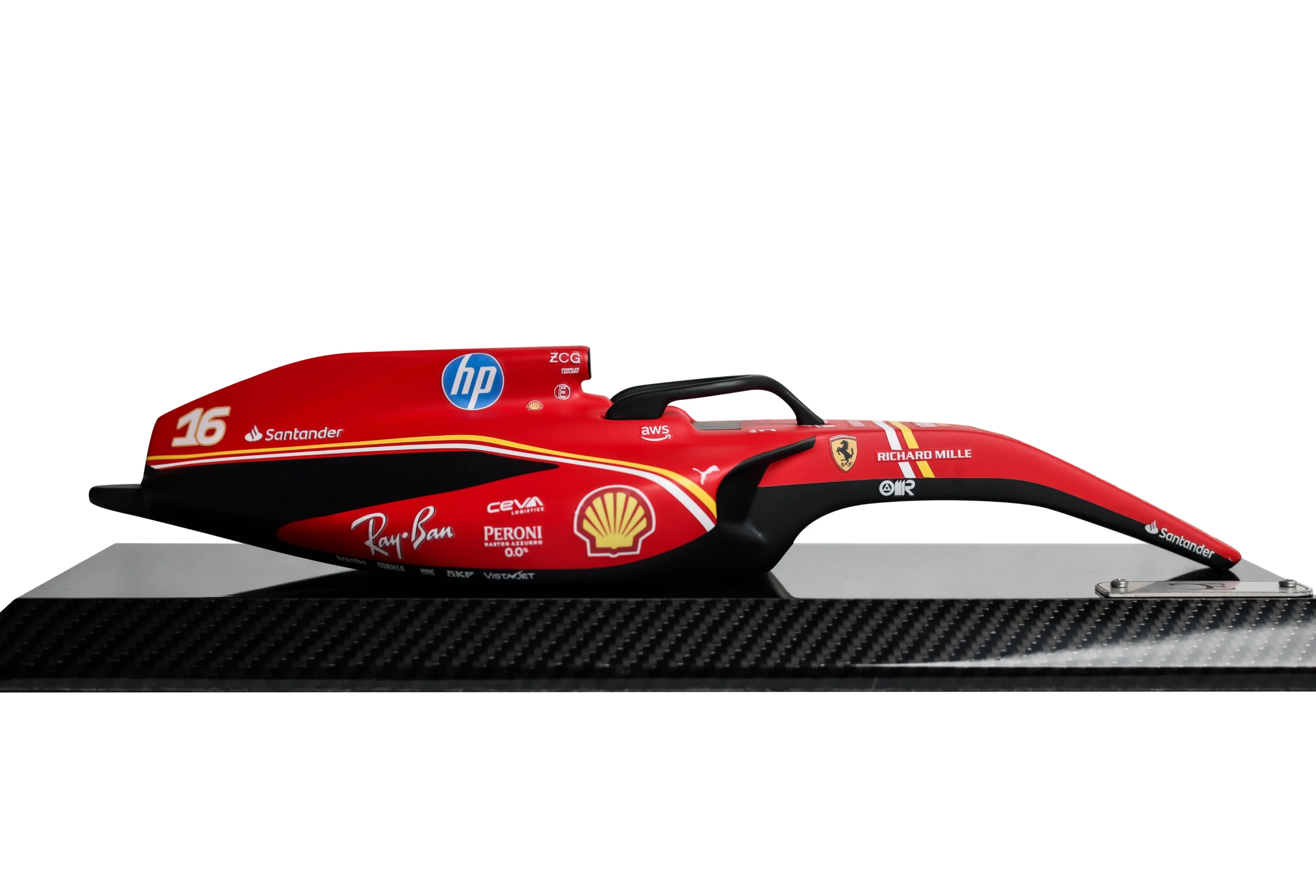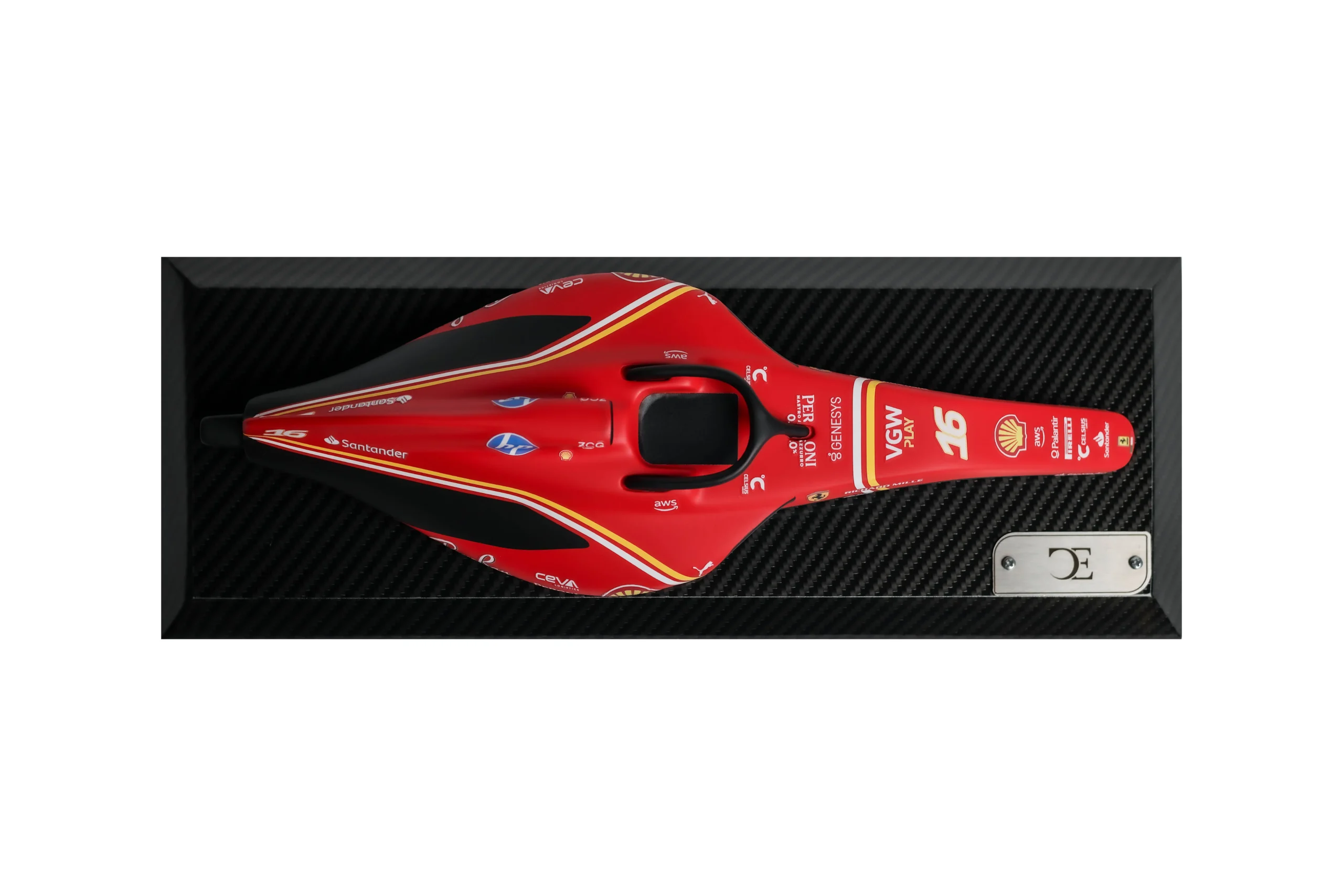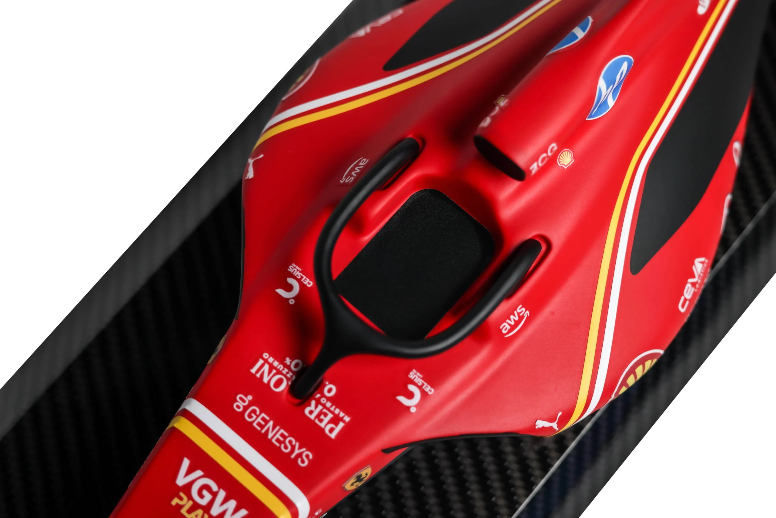 A finely detailed miniature Ferrari SF2024 model mounted on a hydrographic-patterned base. This collectible captures the latest F1 design and craftsmanship, perfect for passionate Ferrari fans and model enthusiasts.