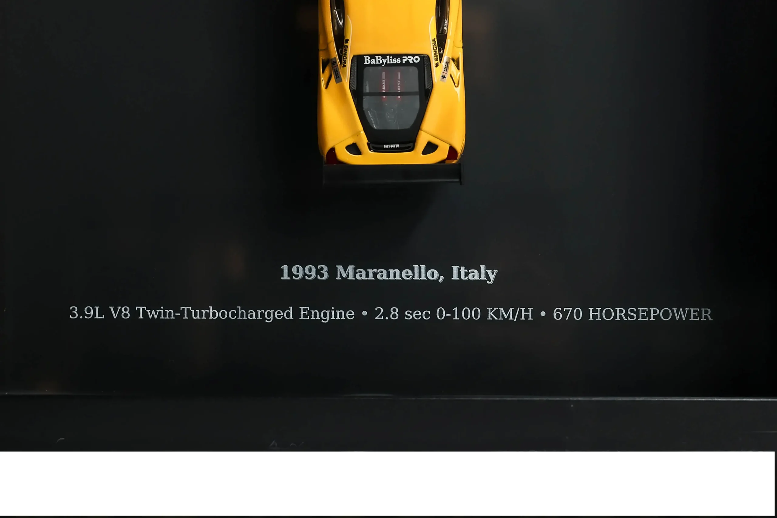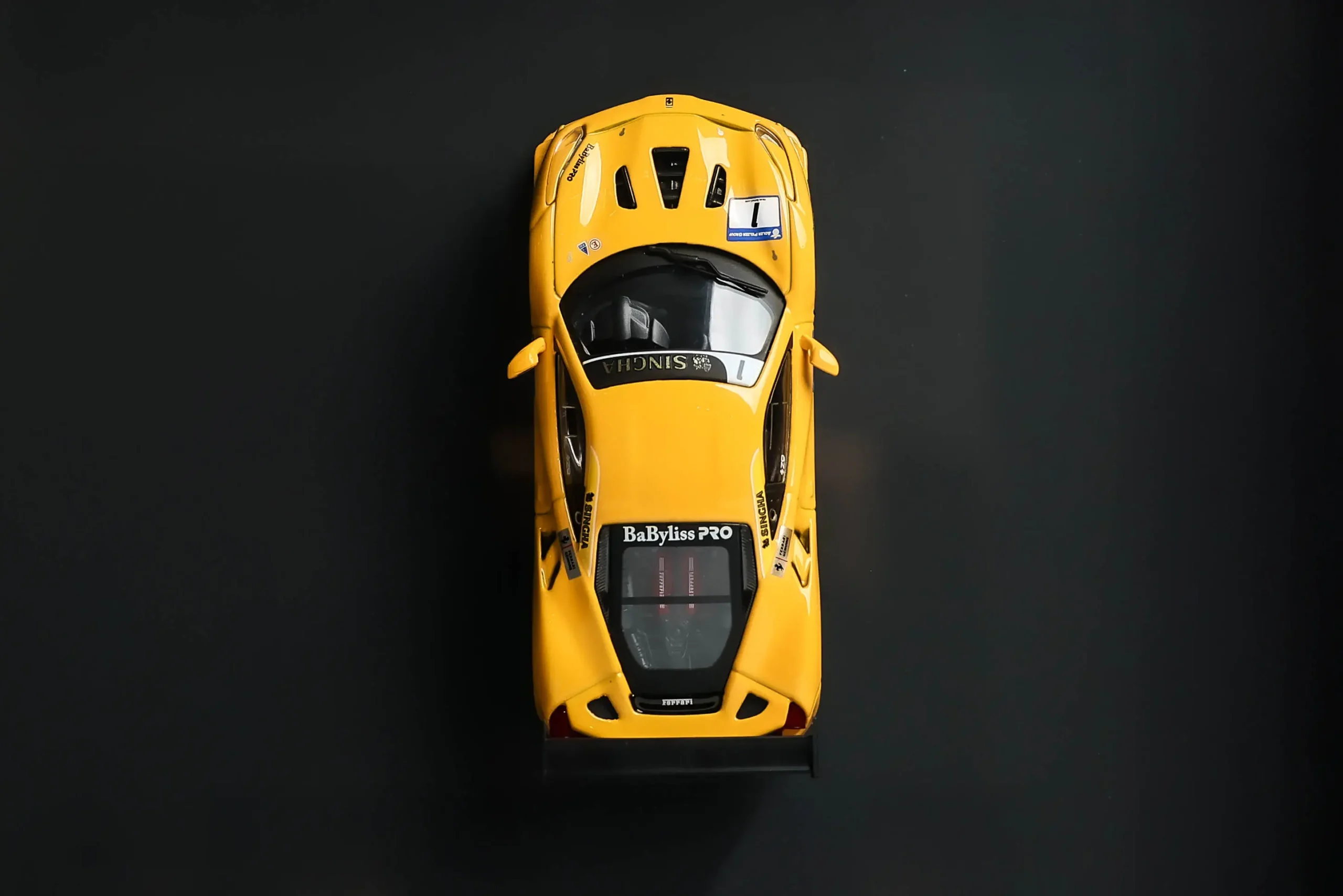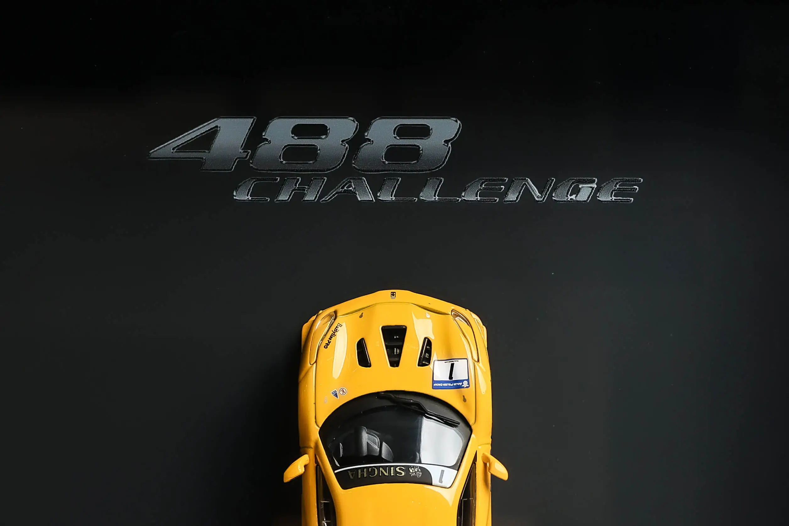 Featuring a bright yellow Ferrari 488 Challenge miniature, this framed collectible brings motorsport energy to any room. A standout for bold display setups.