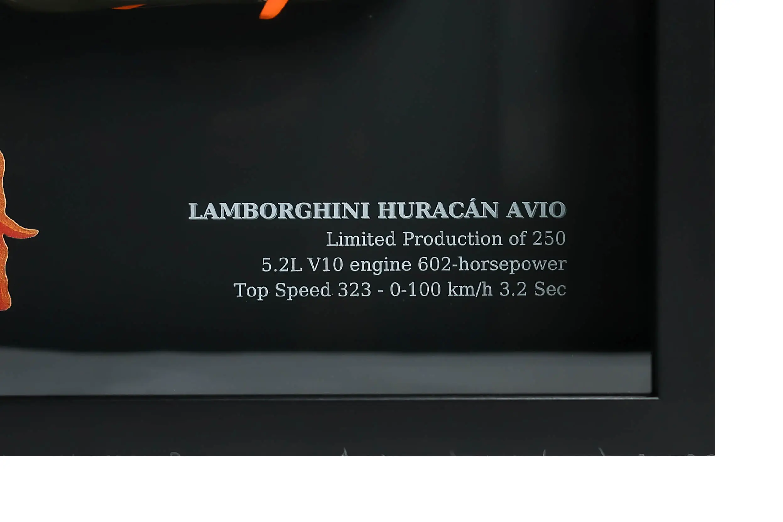 This display frame features a sleek miniature Lamborghini Huracan Avio in matte green. A bold tribute to Italian design and performance, perfect for supercar collectors.