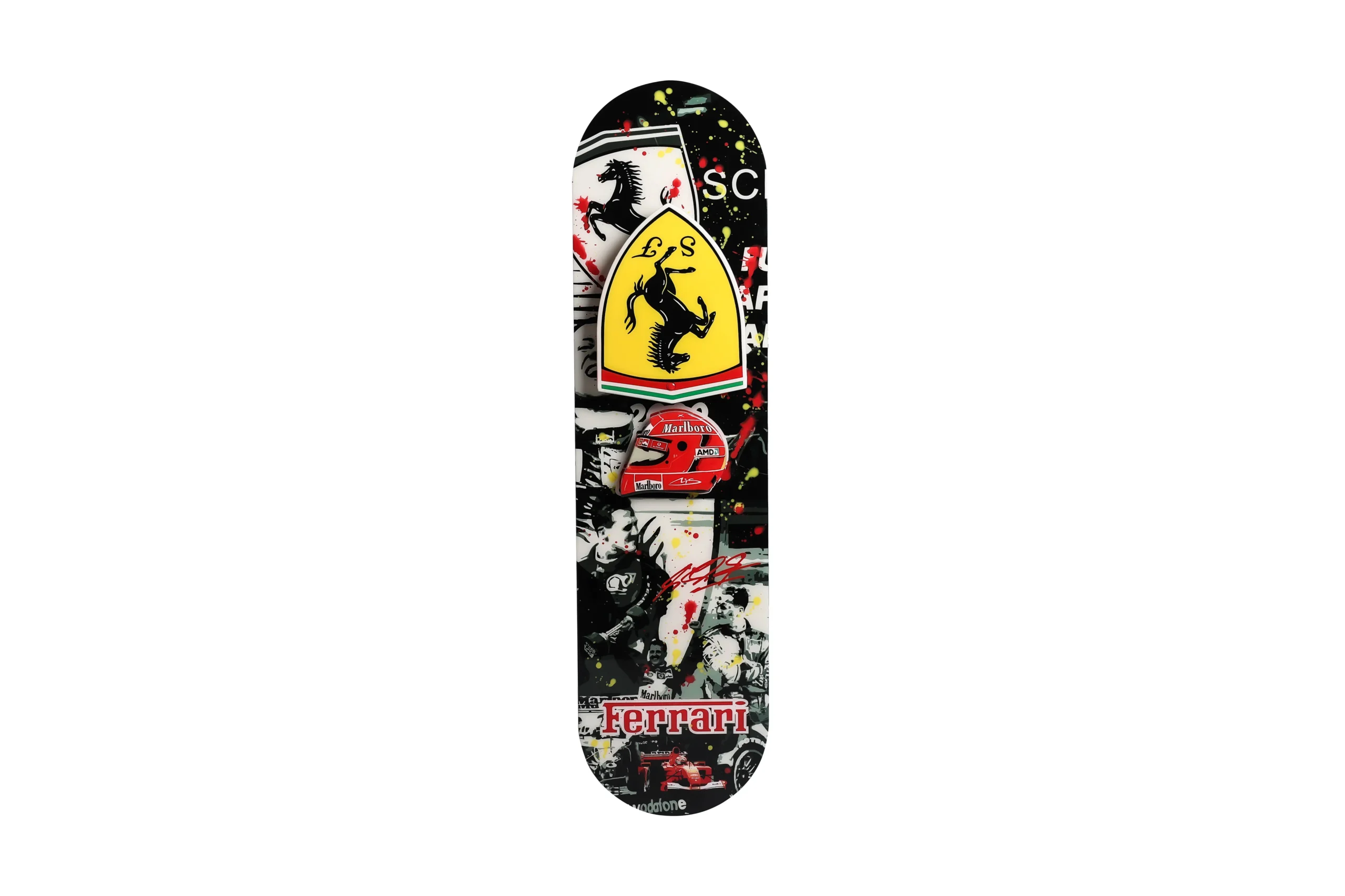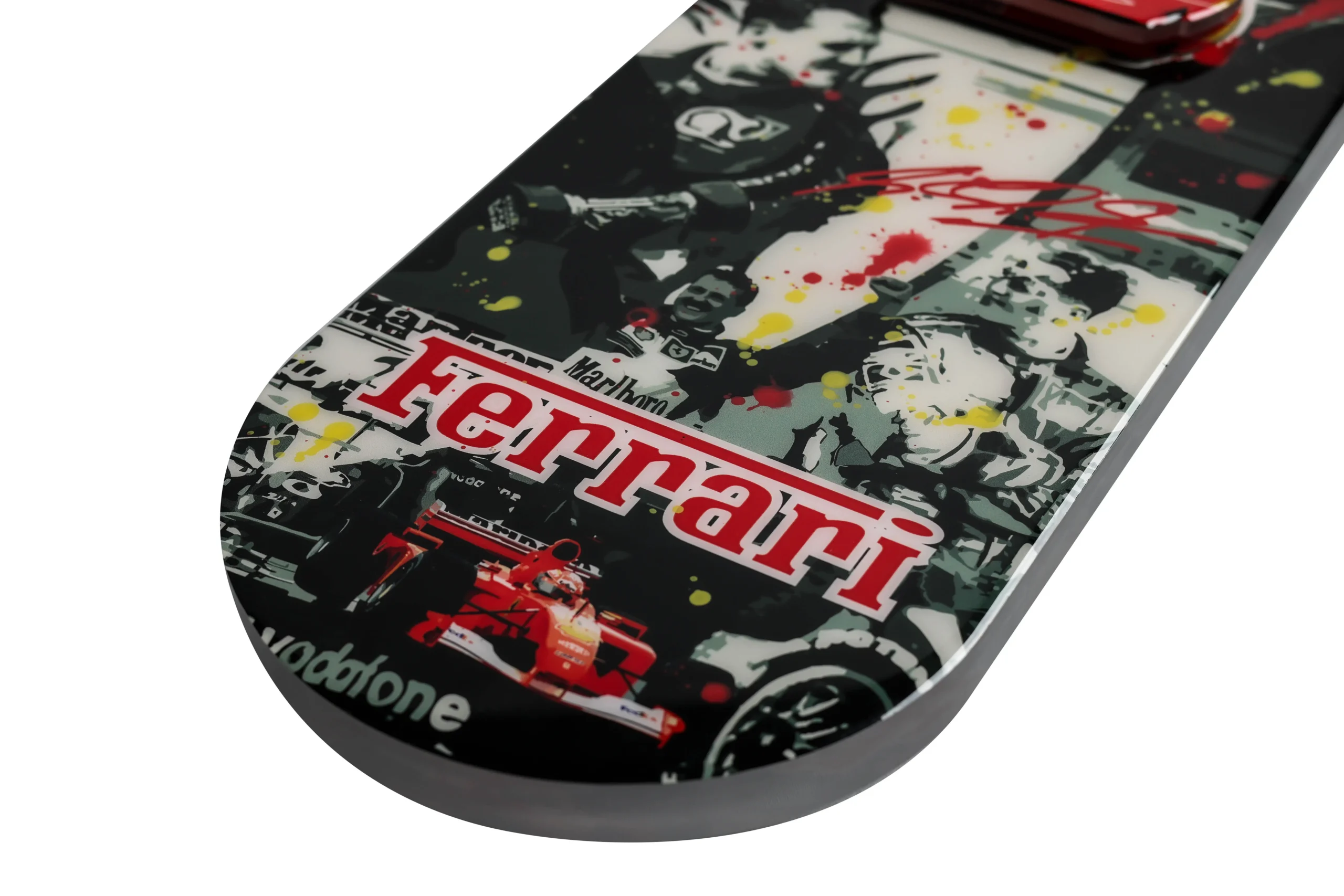 A clear plexiglass skateboard with Ferrari design elements. This art-meets-speed piece blends transparency with motorsport legacy, making it a futuristic collectible for display, not tricks.